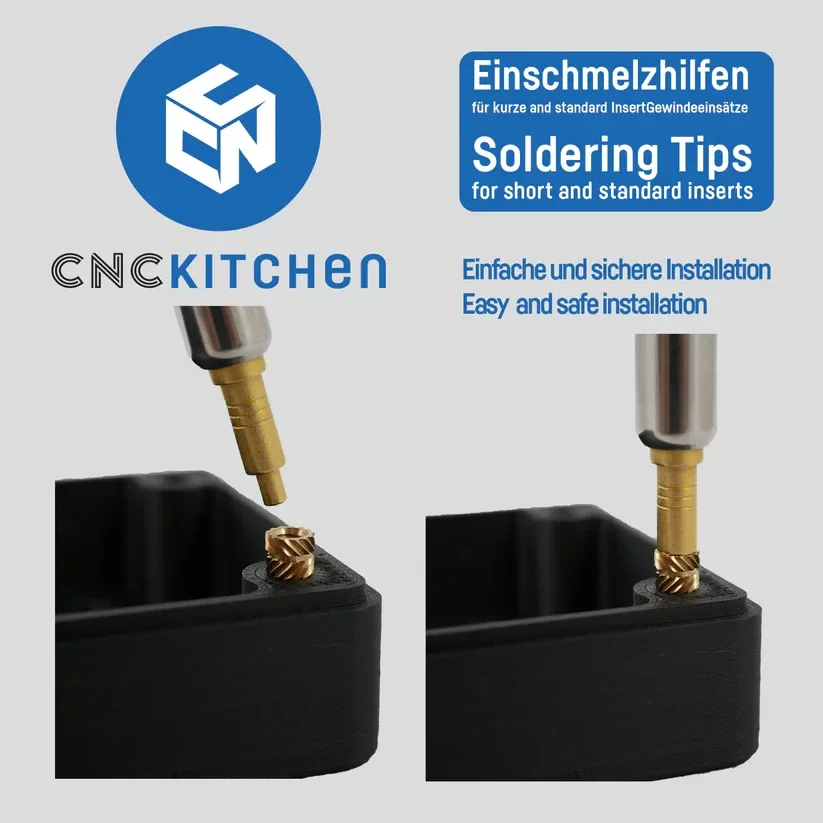 Threaded inserts not only look great in 3D printed parts, but they also have a practical use. Everyone has had a device that was assembled with screws. After disassembling and reassembling it a few times, you realize that if the screws dug directly into the plastic, they won't hold anymore. Each time you screw the parts together, the material gets plastically deformed at the threads, which eventually leaves you with nothing but a ragged hole where nothing can grab. This is where thread inserts come into play. By melting them into your parts, they are positively bonded to the plastic and no longer move. The screws are now turned into durable and also low-friction brass and thus will last forever.
